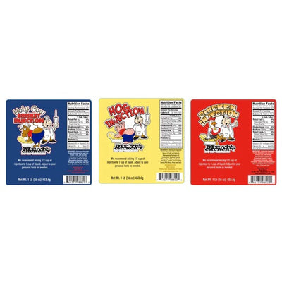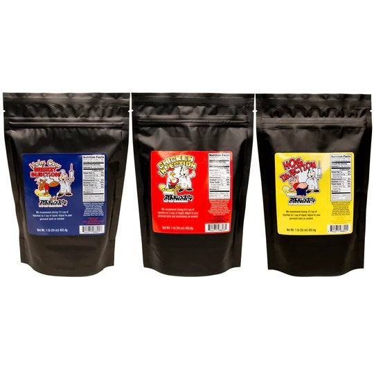 All 3 of our injections for the lowest price of $43. 1 Holy Cow Brisket Injection, 1 Pork Injection, and 1 T-Bird's Chicken Injection. That's 3 lbs of injection. You won't find a better deal on injections online!