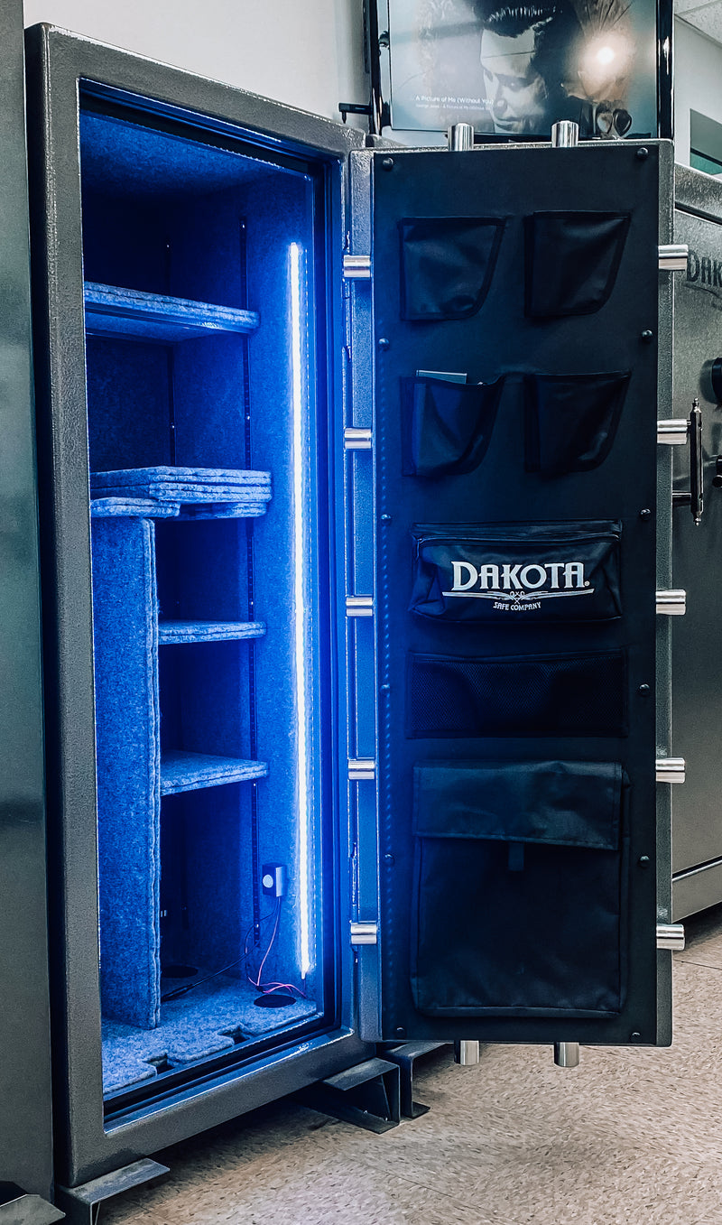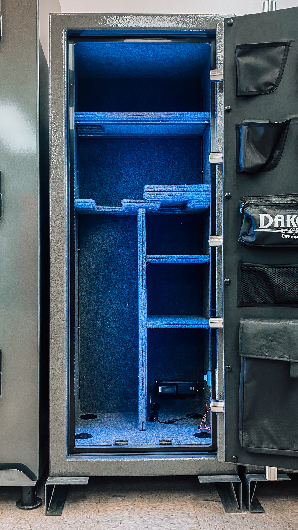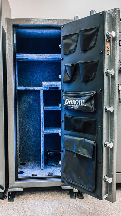 All safes have hardened steel plates to protect the vital parts of the safe. Making it so no one can just come in and drill the locks. All safes have a re-locker, and a spring loaded pin. This pin is tripped, if tampered with, and locks up the whole mechanism. This feature is ONLY found in upper end safes. All safes have a handle design that utilizes a slip clutch to disengage the handle and keeps it from engaging the bolts. Again, this feature is one that is usually found in upper end safes. All safes have under shelf support bars on all big shelves. You can load your shelves with ammo and a year later they will still hold their rigid form. All safes have four bolt down holes so you can anchor them in place. All safes have fire rated gypsum interior linings with a 120 minute / 1250° Degree Fire Rating. This makes the Dakota Safe the most secure fire resistant safe in its class. Fully continuous welds throughout. You will never see a spot weld on one of our safes. This is one more way that we will provide the best value for your dollar. And yet again, this feature is ONLY found in upper end safes. All safes come with expanding door seals made to expand at higher temperatures. All safes come with Grey fabric interiors, including the gun and storage shelving. Black hardware finishes out this very impressive safe at this price range. We inspect our safes to guarantee that they are the highest quality safe in its price range.
