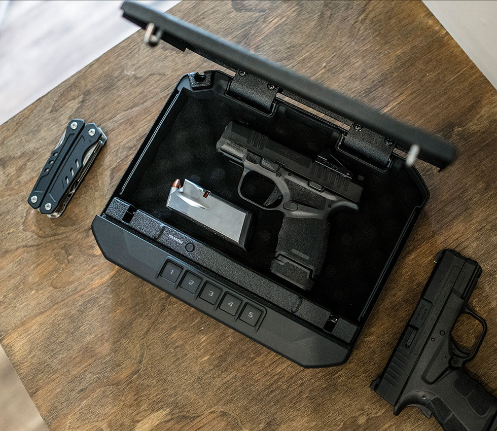 Compact designis portable for travel in your car, the office, or backpacks and luggage and can securely hold 1 handgun and extra magazines.