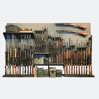 Gun Wall Kit #5 is designed to go above an existing cabinet. The system can accommodate 36 guns positioned vertically with Cradles and Stock Bases. It can also hold 2 guns horizontally with our Horizontal Rifle Display Mounts, and 3 pistols on our Single Pistol Pegs. Last it includes 5 of our Six-Gun Rifle and Gear Shelves which can be used for either guns or gear. Apply the panels to any wall utilizing accessories, creating a customized gun wall system for your closet or gun room.
