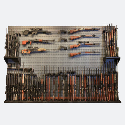 Gun Wall Kit #7 is designed to go above an existing cabinet. The system can accommodate 60 guns positioned vertically with Cradles and Stock Bases. It can also hold 7 guns horizontally with our Horizontal Rifle Display Mounts, and 3 pistols on our Left Display Mount Pistol Pegs. Last it includes 2 Metal Storage Trays, 3 AR Mag Holders, and 2 of our Six-Gun Rifle and Gear Shelves which can be used for either guns or gear. Apply the panels to any wall utilizing accessories, creating a customized gun wall system for your closet or gun room.